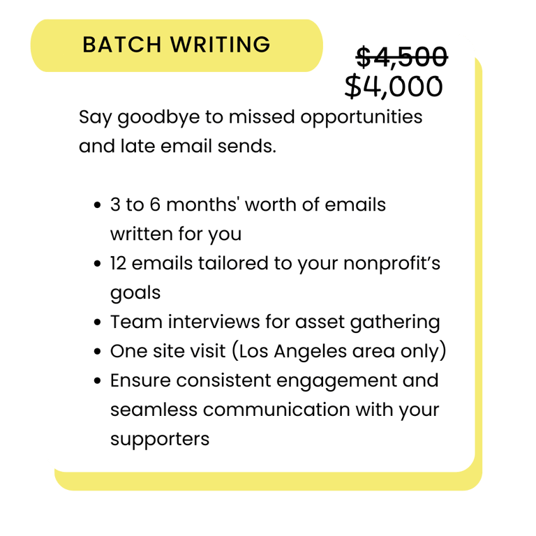 Book your Batch Writing service or custom Training before May 31 at a discounted deposit of $500 ($200 for Training). I'll send over a contract within 2 business days.
